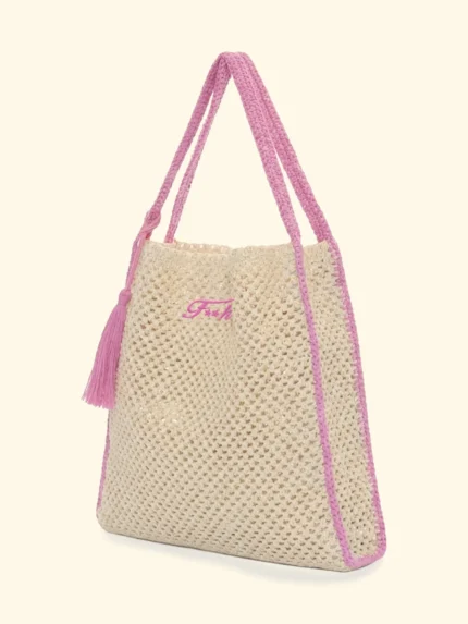 BORSA MARE EFFEK IN RAFIA DELLA COLLEZIONE ESTATE 2026. FODERATA CON LOGO RICAMATO NEL COLORE FUCSIA
