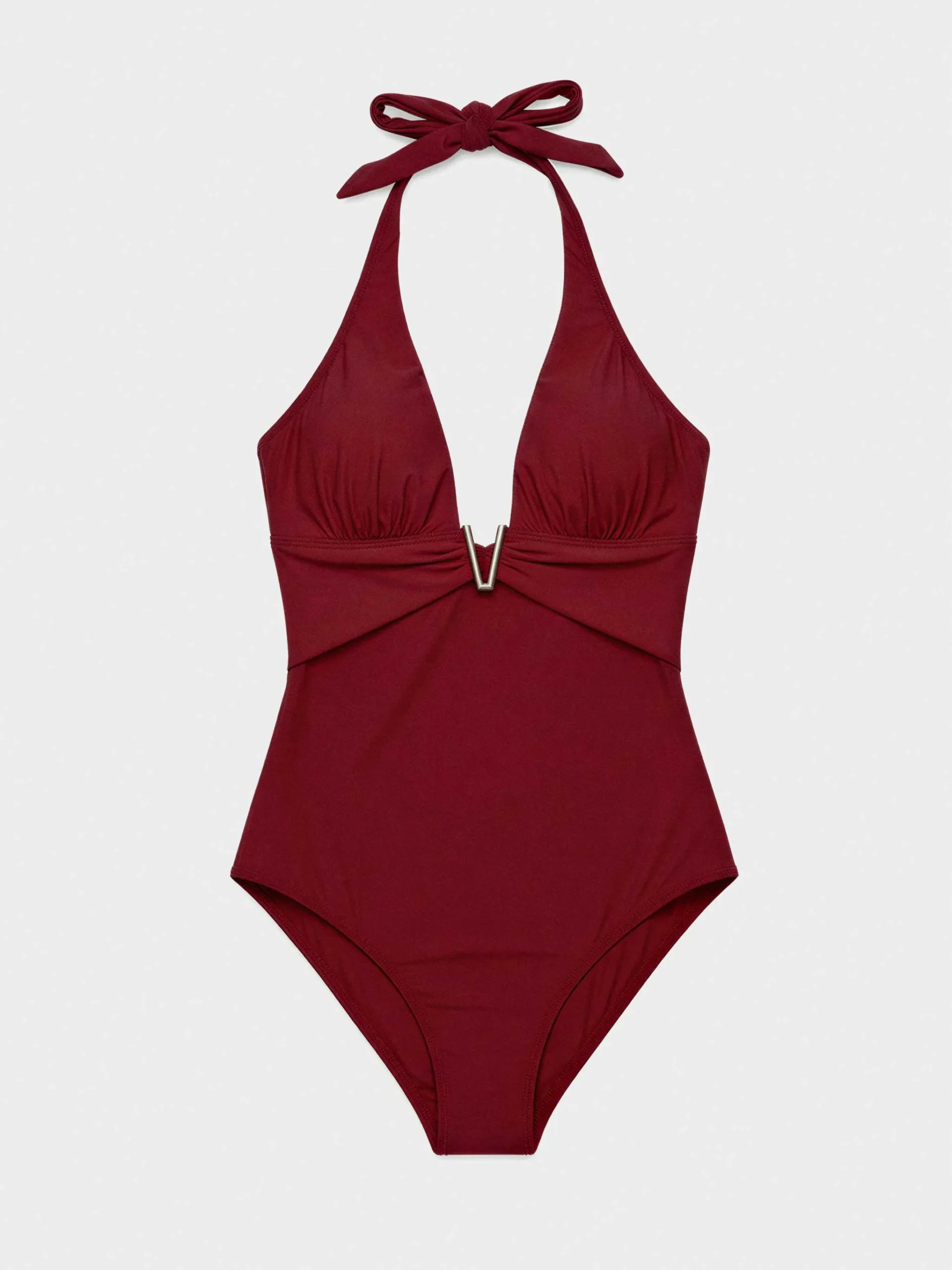 Costume da bagno halter con fiocco e scollo profondo con coppa fissa e dettaglio in metallo sullo scollo