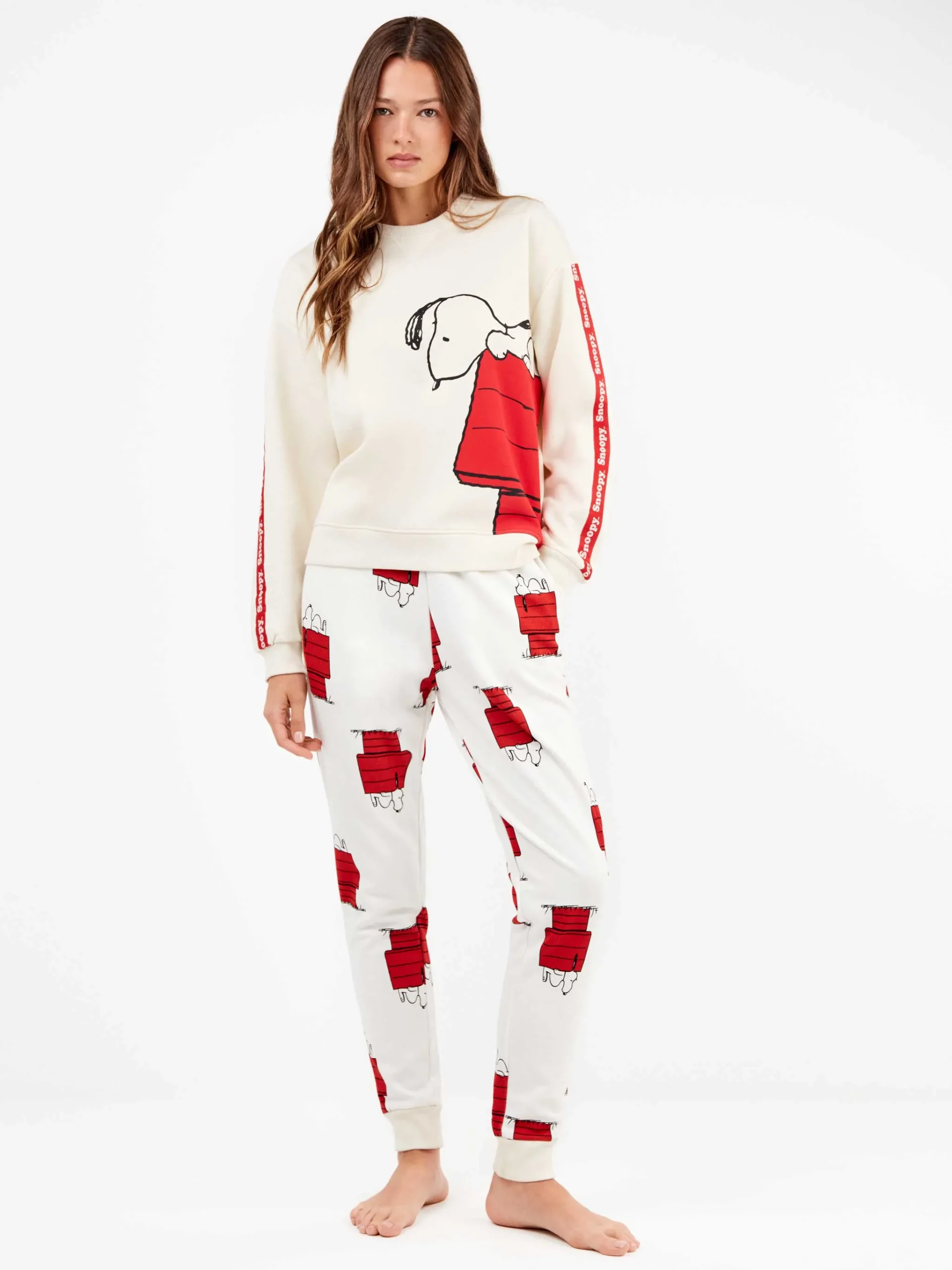 La maglietta presenta una graziosa stampa della casa di Snoopy, uno dei personaggi più amati di sempre, simbolo di dolcezza e spensieratezza. I dettagli a costine su colletto e maniche e le rifiniture sui polsini donano un aspetto curato e femminile, mentre i fiocchetti decorativi aggiungono un tocco romantico e delicato. I pantaloni coordinati, anch’essi con stampa della casa di Snoopy, sono dotati di tasche funzionali e di una coulisse metallica regolabile in vita, che consente di personalizzare la vestibilità mantenendo il massimo comfort.
