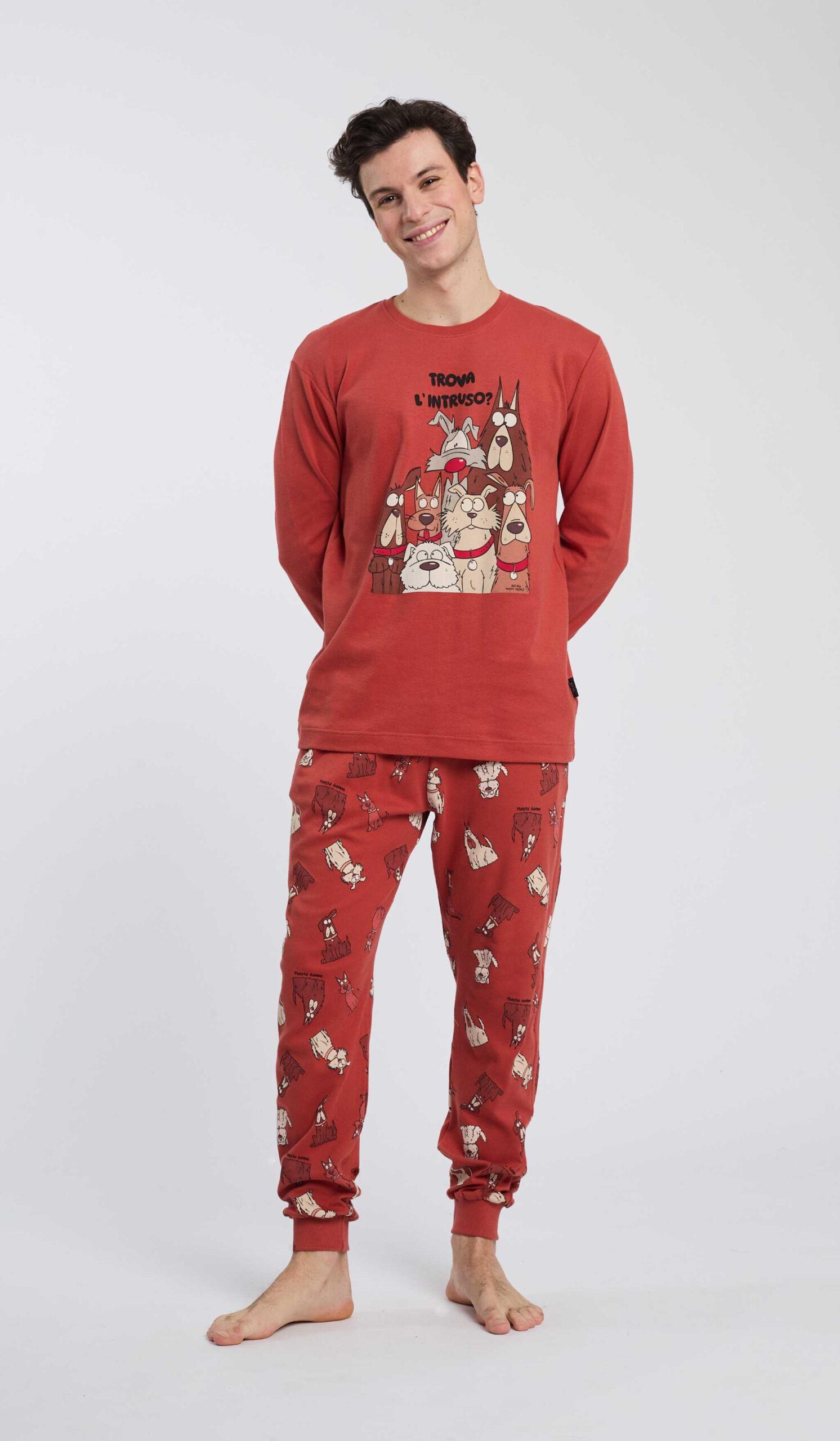 PIGIAMA UOMO HAPPY PEOPLE “TROVA L’INTRUSO” COLOR MATTONE CON PANTALONE STAMPATO
